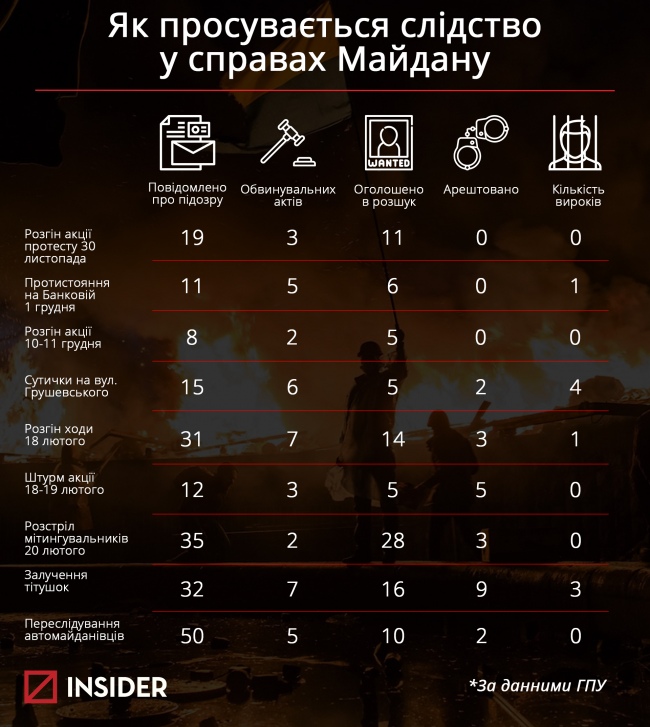 Все производства по противодействию протестам на Майдане остались в департаменте Горбатюка. По большинству из них уже есть переданные в суд обвинительные акты. Однако сотни «беркутовцев» и «титушек», которые били и убивали активистов, до сих пор не сидят за решеткой.