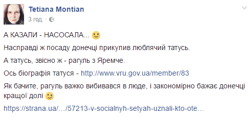 "А говорили – на***ала… На самом деле должность дочери прикупил любящий отец. А папа, конечно же - рагуль из Яремче… Как видите, рагуль трудно выбивался в люди и закономерно желает дочери лучшей доли", - прокомментировала адвокат Татьяна Монтян.
