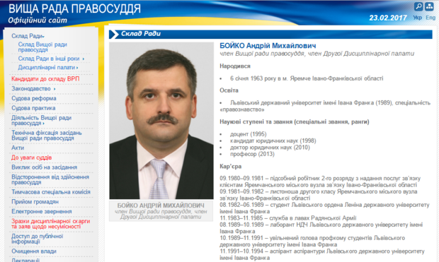 "Молодая львовянка является дочерью экс-декана юридического факультета Львовского национального университета им. Ивана Франко Андрея Бойко, который сейчас является членом Высшего совета юстиции. Об этом свидетельствуют данные, которые указал Андрей Бойко в автобиографии", - говорится в сообщении.