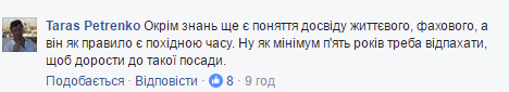 "Кроме знаний, еще есть понятие опыта жизненного, профессионального, а он, как правило, является производной времени. Ну как минимум пять лет надо отпахать, чтобы дорасти до такой должности", - написал Тарас Петренко.