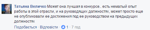 "Может, она лучшая в конкурсе.. есть немалый опыт работы в этой отрасли и на руководящих должностях, может, просто еще не опубликовали ее достижения под ее руководством на предыдущих должностях", - вступилась за девушку Татьяна Величко.