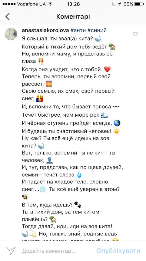 «Дельфиньчики! Давайте помогать активнее! Ведь групп китов очень много становится!! Но нас тоже не мало! Спасибо что вы с нами дельфины! С уважением к вам Администрация группы!!! Мы вас любим, и ценим каждого дельфинчика!» — говорится в одной из таких групп.