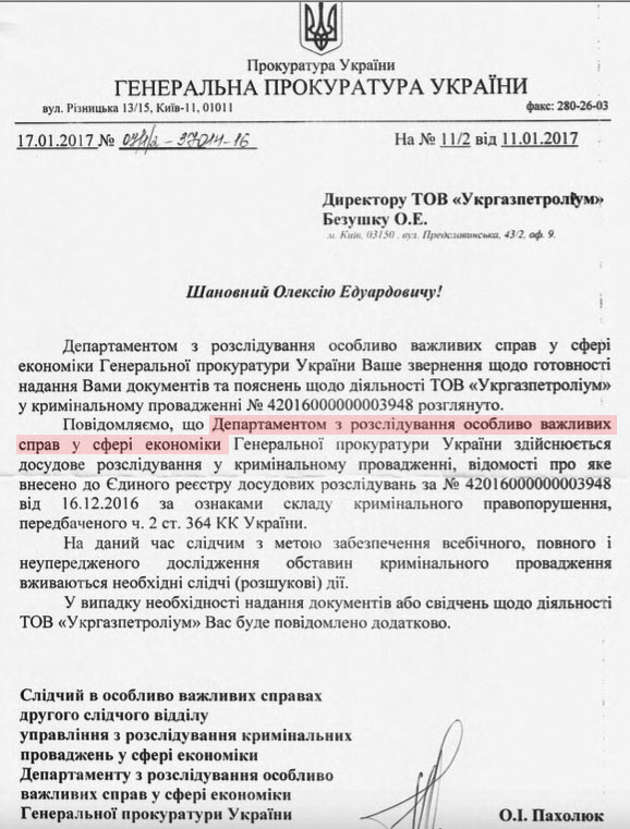 Параллельно с этим департамент по расследованию экономических преступлений Генпрокуратуры (известный в народе как «Департамент Кононенко-Грановского») через месяц после открытия дела СБУ, для закрепления результата, начинает свое расследование по статье" Злоупотребление властью или служебным положением«.