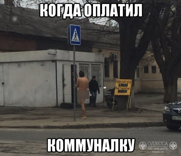 Пока одни гадают, что заставило мужчину обнажится, в соцсетях уже придумывают по этому поводу шутки и делают мемы. "Оплатил коммунальные услуги", – шутливо подписали фотографию прохожего.
