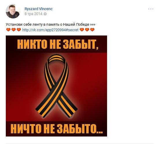 Зокрема, Вінценц публікує такі заклики, як "Слава Червоній армії", а також картинки георгіївських стрічок із підписом "Ніхто не забутий, ніщо не забуто".