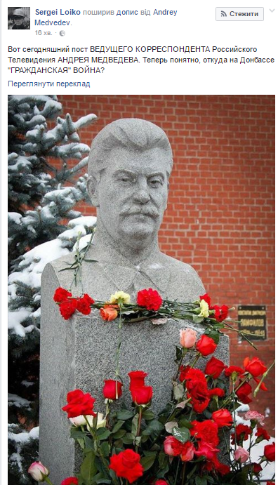 Так, Андрей Медведев в Facebook отмечает: "Вот бюст Сталина у кремлевской стены не мироточит. И ничего. Идут к нему люди. Ну правда не за исцелением, конечно. Просто с цветами. И 5 марта снова пойдут. Принесут красные гвоздики".