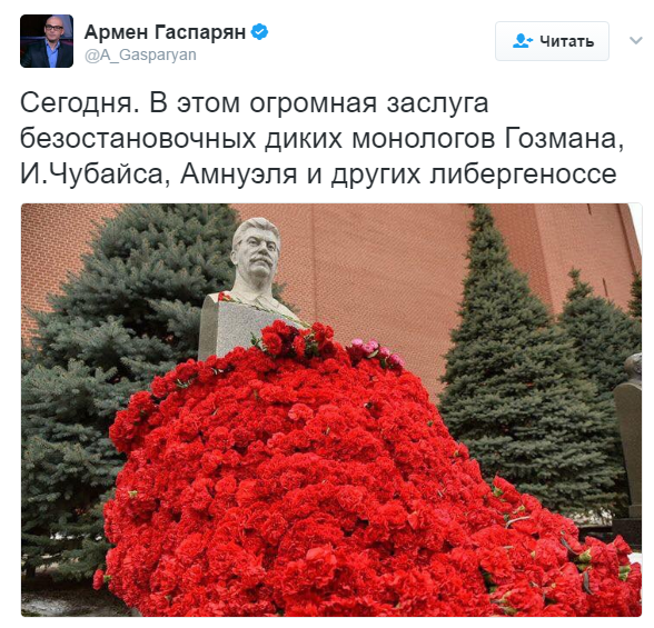 А российский историк, прокремлевский пропагандист Армен Гаспарян обвинил в этих цветах российскую оппозицию: "В этом огромная заслуга безостановочных диких монологов Гозмана, И. Чубайса, Амнуэля и других либергеноссе".