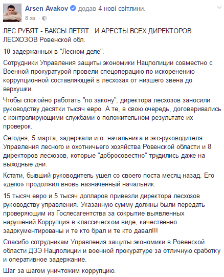 "Сегодня, 5 марта, задержали и.о. начальника и экс-руководителя Управления лесного и охотничьего хозяйства Ривненской области и 8 директоров лесхозов, которые "добросовестно" трудились даже на выходные дни", - рассказал Аваков.