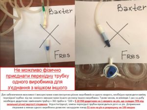 Вместе с тем, препараты «Бакстера» и «Фрезениуса» имеют разные по конфигурации и размерам переходники, которые присоединяются к этим трубочкам. Поэтому физически невозможно присоединить немецкий пакет к американской трубочке пациента.