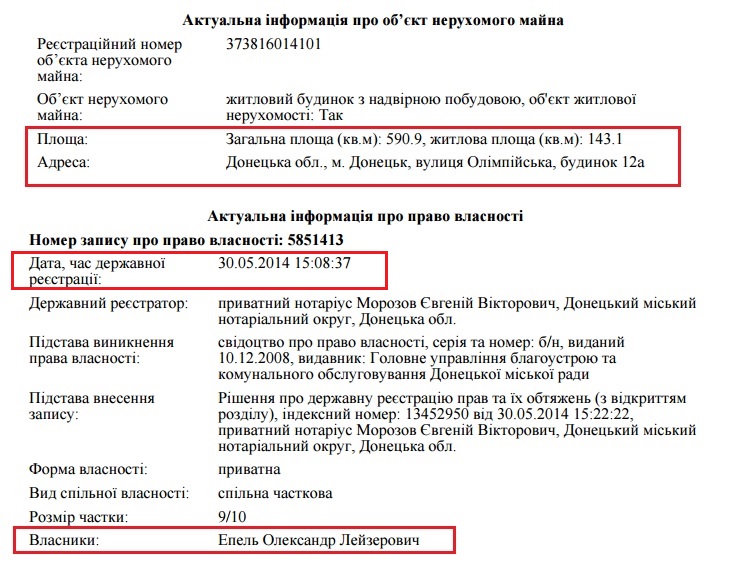 Муж судьи Эпель также владеет домом площадью 590 кв.м. в Донецке, в котором, очевидно, и проживала семья до переезда в Киев, однако зарегистрировано право собственности на этот дом только в мае 2014 года, уже после переезда семьи в Киев и оккупации Донецка.