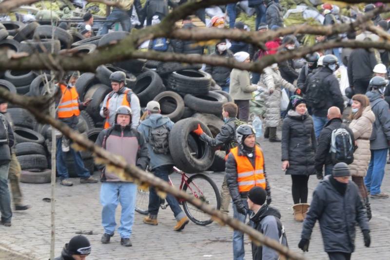 А вот последний снимок репортажа - люди у сложенных в баррикаду шин, они не сдаются, революция продолжается... Володя договорился встретиться с друзьями у входа в дворец - они подошли к Октябрьскому, он вышел к ним.
