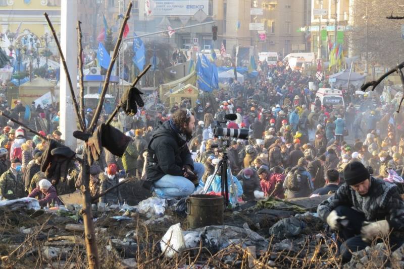 В январе он снимал столкновения на Грушевского. Вот первое фото - в него целится "беркут". Вот "беркут" показывает митингующим неприличный жест - они весело гогочут, упиваясь своей безнаказанностью. Вот плакаты Майдана - он любил их снимать. И после сообщения о расстрелах 20-го февраля он также выехал на Майдан, привез воду, продукты. И сделал здесь свой последний репортаж. Вот он увидел тела убитых у Михайловского собора. Но не испугался, а пошел дальше. Вот он поднимается на Институтскую, на его фотографиях как раз видно как уезжает "скорая", которая увозит раненых. Вот великолепное фото сгоревшего Майдана. Вот он подошел к сожженной машине, которая закрывала обзор стрелкам "Беркута". у Октябрьского дворца. Вот он в самом дворце. Вот он сделал один из последних снимков у Октябрьского дворца - воробышек сидит и позирует ему на ветке... В этот момент власти объявили очередное "перемирие" на Майдане, вроде бы уже не должно быть смертей...