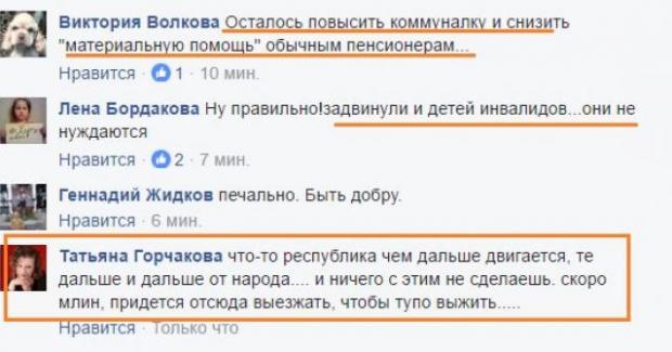 «Осталось повысить коммуналку и снизить „материальную помощь“ обычным пенсионерам», - написала одна з учасниць обговорення. «Задвинули детей и инвалидов… Они не нуждаются», - написала ще одна донеччанка. «Скоро, млин, придется отсюда выезжать, чтобы тупо выжить», - додала третя місцева мешканка.