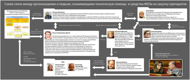 Вот такой семейный уровень интеграции команды Минздрава, пациентских организаций и сотрудников ПРООН был выявлен нашим небольшим исследованием – см. Схему связи между организациями и людьми, осваивающим техническую помощь и средства Минздрава на закупку препаратов.