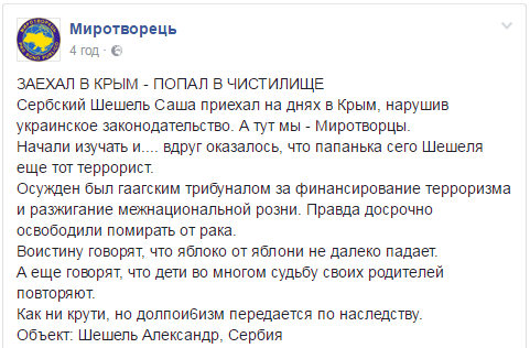 Визит в оккупированный Россией Крым 19 марта совершили депутаты парламента Сербии от "Сербской радикальной партии" Милован Боич и Дубравко Боич, член президиума "Сербской радикальной партии" Александр Шешель, сербский писатель и политолог, профессор Баня-Лукского университета Срджа Трифкович, а также депутат парламента Чехии Ярослав Голик.