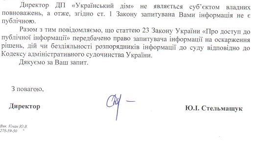 Також, твердить у своїй відповіді директор, «Український дім» є госпрозрахунковим підприємством, діяльність якого спрямована на отримання прибутку. При цьому, як повідомляв «Ні корупції!», ДП «НЦДКС «Український дім» по фінансових показниках у 2014 році вийшов у нуль, а 2015-й рік закінчив зі збитком 527 тис. грн.