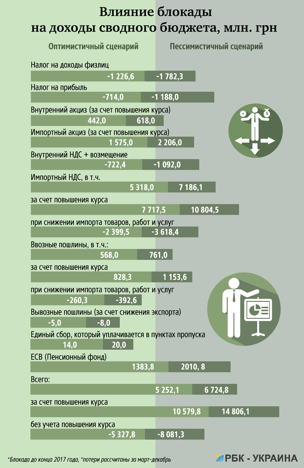 Кабмин рассматривает два сценария развития при блокаде. Минимальные потери будут состоять в снижении темпов роста ВВП на 1,2 процентные пункты (п.п.), росте курса к концу года - на 3 грн/доллар. В случае пессимистического сценария падение составит 2,5 п.п и 5,6 грн/доллар соответственно.