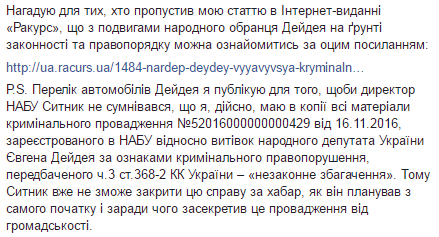 "Перечень автомобилей Дейдея я публикую для того, чтобы директор НАБУ Сытник не сомневался, что я, действительно, имею копии всех материалов уголовного производства №52016000000000429 от 16.11.2016г., зарегистрированного в НАБУ относительно выходок народного депутата Украины Евгения Дейдея по признакам уголовного преступления предусмотренного ч.3 ст.368-2 УК Украины - "незаконное обогащение". Поэтому Сытник уже не сможет закрыть это дело за взятку, как он планировал с самого начала и ради чего засекретил это производство от общественности", - резюмировал журналист.