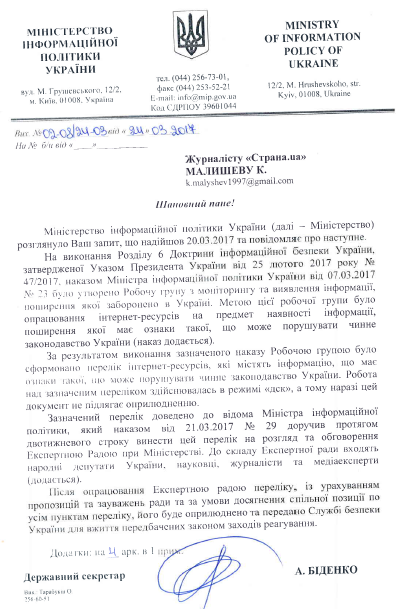 21 марта министр информационной политики Юрий Стець получил полный перечень "антиукраинских" сайтов, - сообщает "Стране" Министерство информационной политики в ответе на наш запрос.