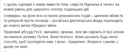Бывший премьер заявил, что это полный бред, но в то же время продуманный сценарий, котором тему "зверств Яценюка в Чечне" решили вывести на новый уровень. Яценюк заявил, что данное обвинение свидетельствует об агонии режима Путина.