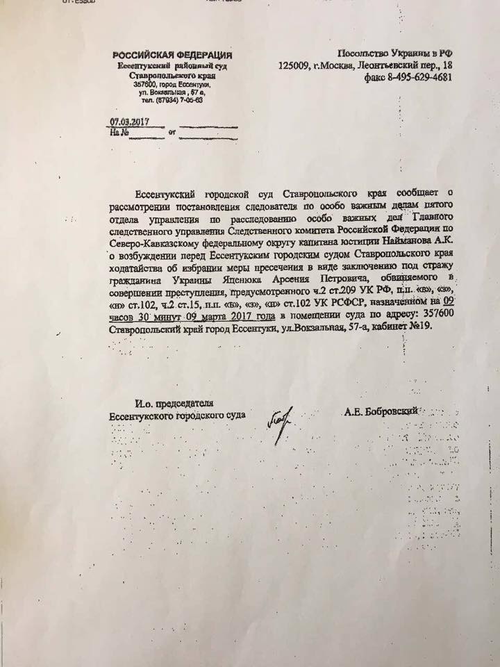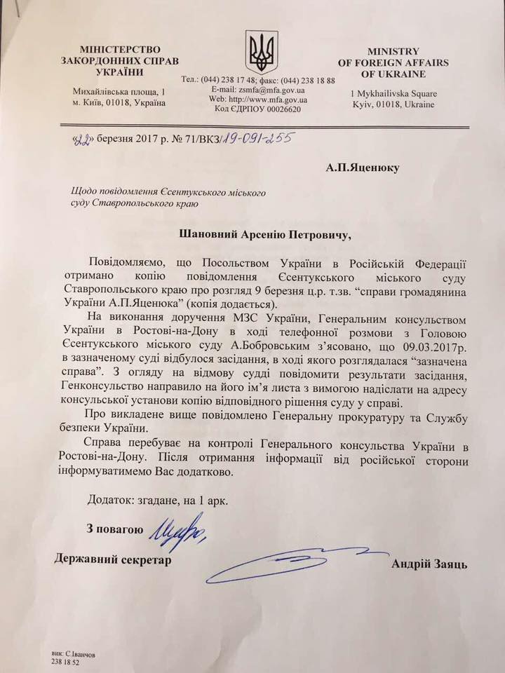 По словам Яценюка, украинское посольство в России получило копию письма от Ессентукского горсуда Ставропольского края. В документе говорится о нескольких делах, которые возбуждены против бывшего украинского премьер-министра. Яценюк также опубликовал скрины полученного документа, передает "Диалог.UA".