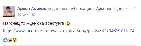 Также информацию об аресте прокомментировал глава украинского МВД Арсен Аваков. "Наконец-то Яценюка арестуют", - иронизирует он.