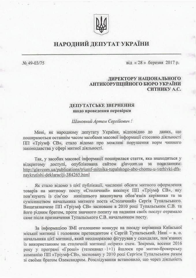 "Є такий персонаж - начальник митного посту "Столичний" Сергій Тупальський. І молодий, і освічений, і перспективний. А тому і начальником митного посту призначили. І у його брата бізнес після цього різко в гору пішов. Звичайно, цей бізнес працює на тому ж самому митному посту", зазначив депутат.