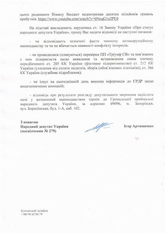 Депутат, зокрема, просить Антикорупційне бюро надати відповіді на наступні питання: чи відповідає дійсності оприлюднена раніше інформація про компанію ПП "Тріумф-СВ", чи планується перевірка цієї компанії щодо виявлення та встановлення ознак злочину, передбаченого ст. 205 КК України (фіктивне підприємництво), ст. 212 КК України (ухилення від сплати податків і зборів), ст. 366 КК України (службове підроблення).