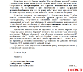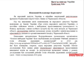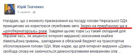 «3 огляду на обширну інформацію, яку я отримую під час численних зустрічей з виборцями, представниками громадськості й бізнесу Черкаської області та моніторингу діяльності Черкаської ОДА, діяльність голови Черкаської ОДА Ткаченка Ю.О. я охарактеризував би як діяльність особи, яка переймається передусім своїми особистими бізнес-інтересами, перебуваючи на державній посаді», – погоджується з висновком експертів КВУ у своєму депутатському зверненні представник парламентської фракції Радикальної партії Віктор Вовк.