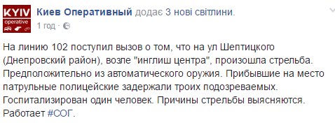 "На линию 102 поступил вызов о том, что на ул Шептицкого (Днепровский район), возле "инглиш центра", произошла стрельба. Предположительно из автоматического оружия", - говорится в сообщении.