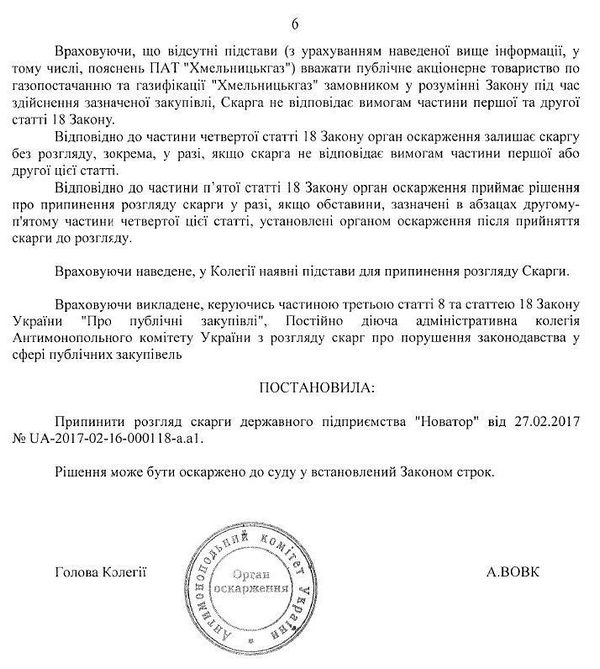В ответ госпредприятие «Новатор» обжаловало дискриминации в админколегии АМКУ по рассмотрению тендерных жалоб. Мол, требуем, чтобы заказчик изменил требования по счетчикам.