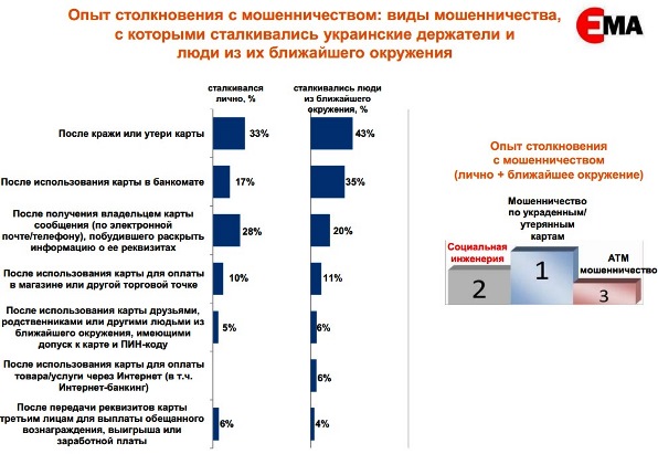 Cогласно социологическому исследованию GfK Ukraine, проведеному по заказу ЕМА, в среднем 23% украинцев лично сталкивались с «социальным» мошенничеством.