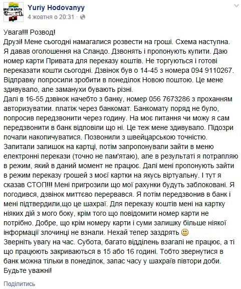 Традиционными жертвами злоумышленников остаются пользователи Интернет-аукционов, которые вывешивают на сайт объявление о продаже товара. Обычно с ними связывается покупатель, который готов перечислить на карточку деньги, однако при этом просит предоставить все данные карты (CVV-код, срок действия, пин-код), а не только ее номер. В последнее время для пущей убедительности мошенники начали добавлять в свою схему фальшивого банковского сотрудника, который рассказывает, что пострадал сервер банка, находящийся в зоне АТО, часть базы утрачена, а Ваши данные клиента якобы необходимы, чтобы ее восстановить.