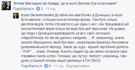 «Новым председателем фракции партии «Блок Петра Порошенко» в ВР почти единогласно избран народный депутат Артур Герасимов. Вот дилемма — поздравлять или нет? Вроде как я был у него в 2012 начальником Службы безопасности. Артур, даже боясь Армена Саркисяна, ночевал у меня дома, вечерами рассказывая на балконе о внутренней кухне в ВР. Вместе ездили в Ялту на экономический форум. Даже ночевали в одном номере в гостинице», — написал Бес.