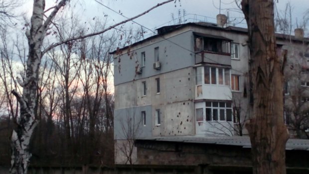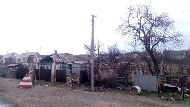 Військові показують на будинки поблизу КПВВ. Кажуть, там, де нове перекриття – значить були обстріли і руйнування. Тож довелося відновлювати. На деяких з будинків, які відремонтували, видніються сліди від обстрілів. Снаряд двічі потрапив в ту же ціль…