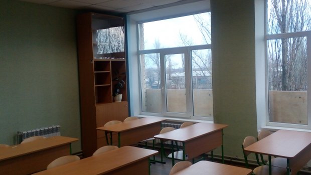А також новий клас на третьому поверсі. Адже один із снарядів попав просто в будівлю. 750 квадратний метрів приміщення на трьох поверхах були знищені. Обійшлося без людських жертв, адже обстріли проводили вночі. Відбудували все завдяки іноземним організаціям і фондам. З цього ж класу видно і позиції бойовиків.