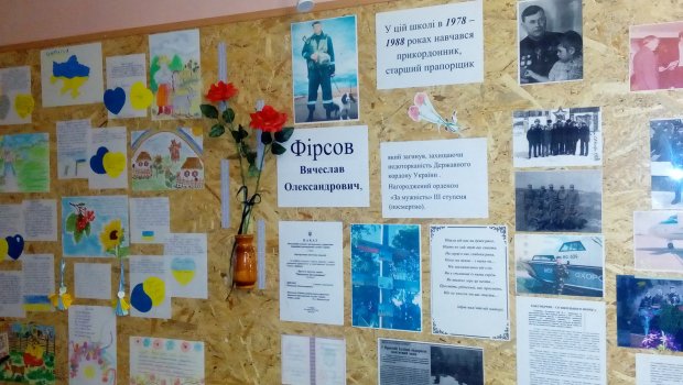 На вході до школи – меморіальна таблиця прикордоннику В’ячеславу Фірсову. Він навчався в цій школі і загинув на війні неподалік. Ще одна дошка пам’яті – у самій школі. Її зробили учні власними руками.