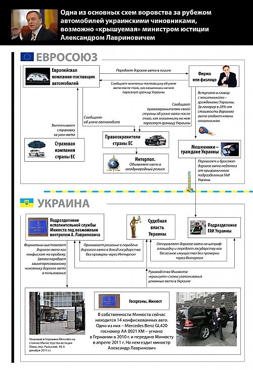 Но Лавринович, сам того не понимая, своим заявлением проболтался о целой схеме, по которой из ЕС в Украину краденые авто шли целым потоком – и «легализовались» с помощью Минюста. Причем, воровали их в Европе тоже хитро: по договоренности с владельцами, которые получили потом страховку плюс 20% стоимости автомобиля от «угонщиков». То есть по этой схеме украинский Минюст фактически «обувал» европейские страховые компании!