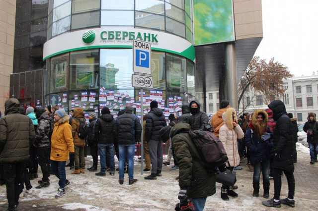 А 13 марта националисты замуровали отделение Сбербанка России в Киеве неподалеку от станции метро Золотые ворота. Затем подобные акции прошли и в некоторых других отделениях российских банков по всей стране, но вскоре процесс затих.