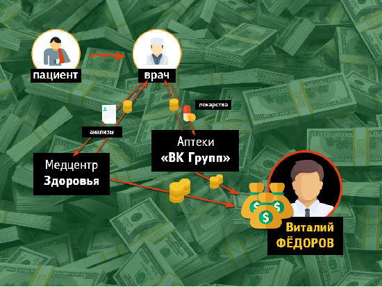 Таким образом, Виталий Федоров не стесняется наживаться на больных людях, в том числе и страдающих онкологическими заболеваниями, которые на последние деньги покупают лекарства и сдают анализы в подконтрольных ему заведениях.