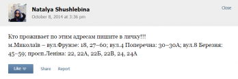 Наталья Шушлебина настойчиво разыскивает николаевцев, проживающих по адресам: ул. Фрунзе 18, 27 – 60, ул. 4 Поперечная 30 - 30А, ул. 8 Марта 45 – 59, пр. Ленина 22, 22А, 22Б, 22В, 24, 24А. Об этом свидетельствует удаленная с ее страницы запись, а также сообщение в социальной сети, отправленное человеку, предоставившему переписку.