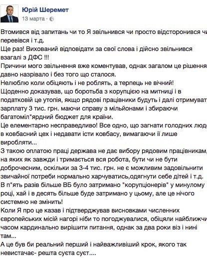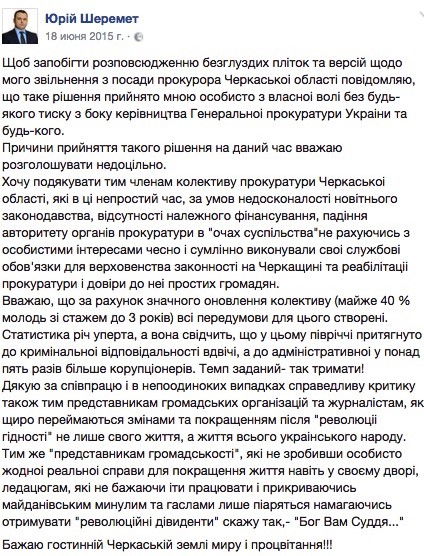 “Щоб запобігти розповсюдженню безглуздих пліток та версій щодо мого звільнення з посади прокурора Черкаськоі області повідомляю, що таке рішення прийнято мною особисто з власноі волі без будь-якого тиску з боку керівництва Генеральноі прокуратури Украіни та будь-кого. Причини прийняття такого рішення на даний час вважаю розголошувати…” недоцільно”.