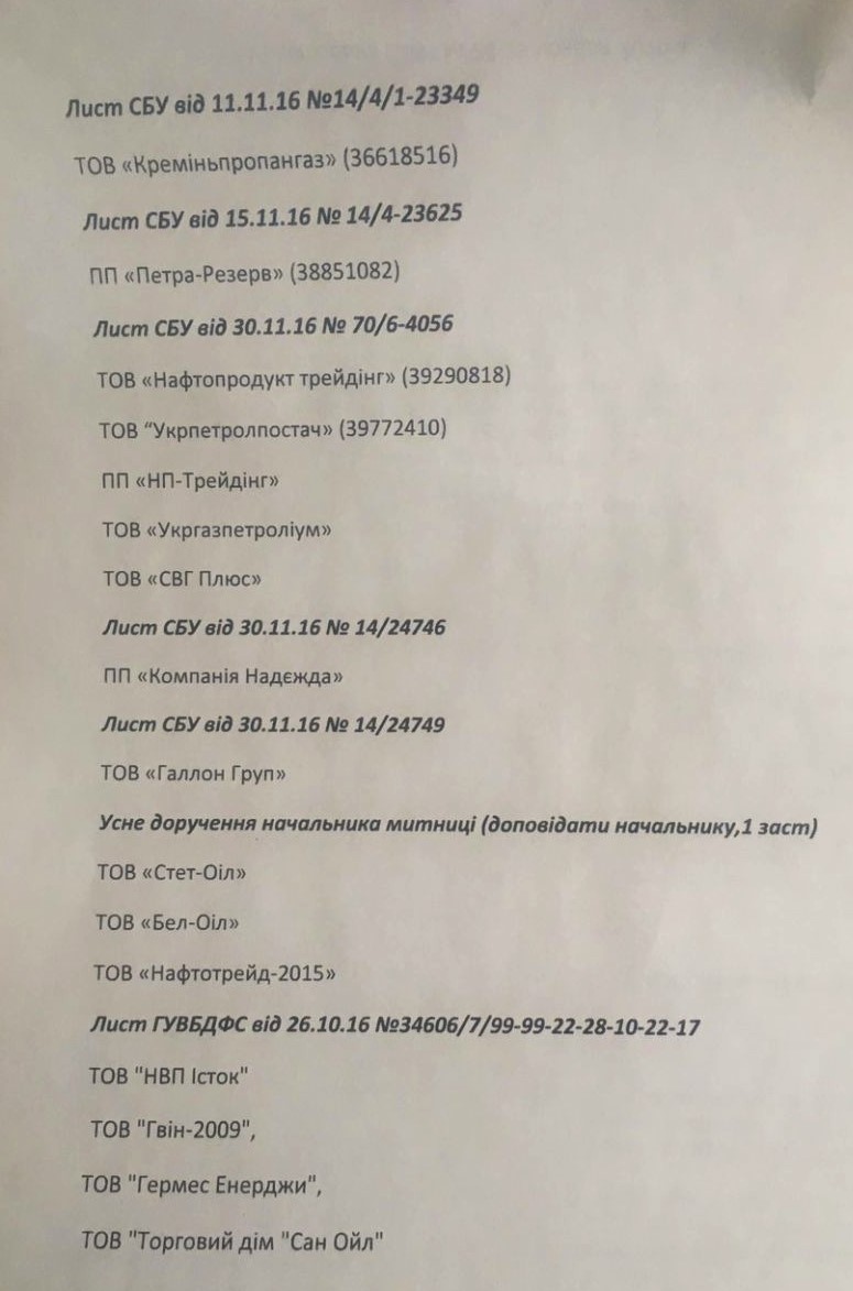 В этом был и его личный интерес: участие в рейдерстве “БРСМ-Нафта” в пользу зятя прокурора Гузыря (ОРД об этом писало в статье про Насирова). Поэтому юрлица сети “БРСМ-Нафта” были “внесены в список на основе устного поручения начальника таможни. Еще четыре юрлица, связанные с сетью АЗС SUN OIL, блокируются на основе письма ГФС”.