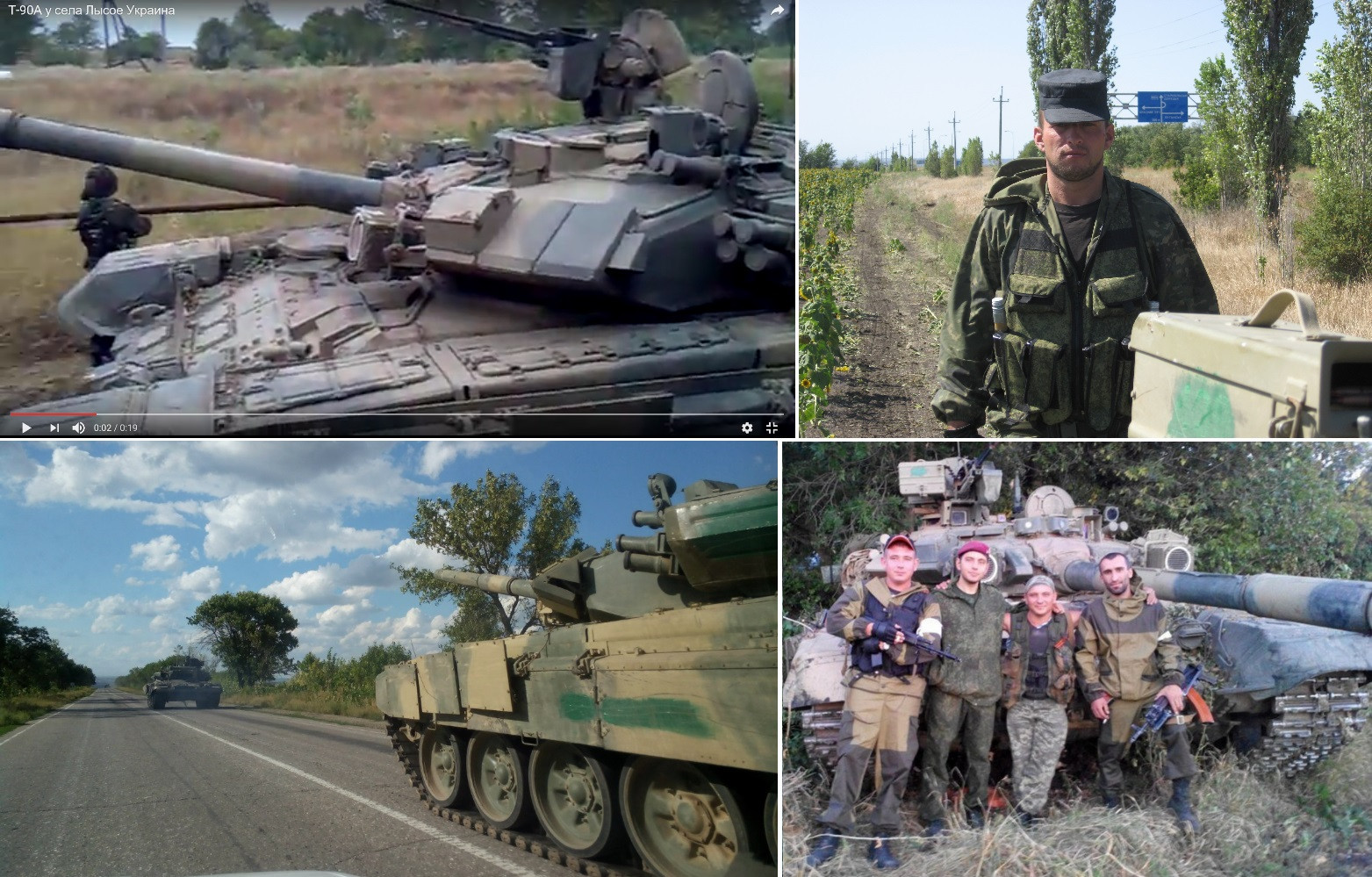 Впервые о российских танках Т-90 в зоне АТО заговорили еще летом 2014 года. Об их наличии свидетельствовали бойцы, а позже в сети опубликовали видео, снятое, скорее всего, 25 августа 2014 года, во время боев за Иловайск. На нем видно несколько уничтоженных танков, о которых идет речь. Оно было снято рядом с железнодорожным переездом на юго-восток от села Лысое (48.469797 39.596891), расположенного в Луганской области.