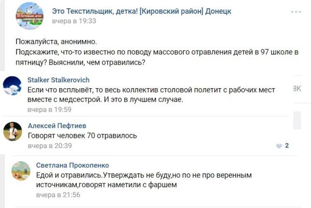 При этом дончане пишут, что на родителей школьников оказывается давление с целью не допустить разглашения информации, однако сами родители не сомневаются, что школьники отравились едой из местной столовой. Дончане подчеркивают, что гуманитарную помощь специально отдают в школы, а также осуществляют продажу в торговых точках города. Распоряжение об этом было отдано лично Захарченко.