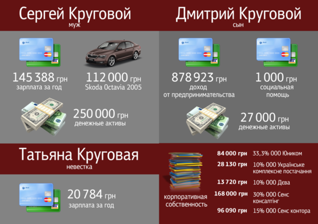 Как выяснилось в ходе журналистского расследования, сын судьи Дмитрий Круговой – бизнес-партнер Маслова в 5 компаниях. Но почему-то в декларации судьи Круговой за прошлые года было указано, что сын владеет долями всего лишь трех фирм – ООО «Юником» (доля владения 33,33%), ООО «Дева-71» (10%), ООО «Украинская комплексное снабжение» (10%). Что это – сокрытие доходов членов семьи с целью уклонения от налогов или «забывчивость»? Кстати, в декларации же за прошлый год ошибка была исправлена: Светлана Самуиловна указала еще две фирмы, в которых ее сын имеет доли вместе с Леонидом Масловым – ООО «Фирма «Сенс-Консалтинг» и ООО «Сенс-контора». Но ни в одну из деклараций кандидат в Верховный Суд не внесла собственность 100% корпоративных прав сына в ООО «Лукьянцы» (Харьков, ул. Академика Проскуры, д.1)!