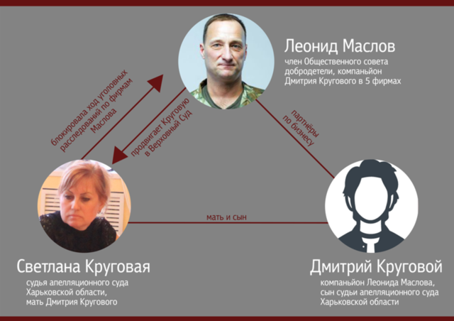 Интересен и тот факт, что фирма Леонида Маслова «Сенс-Консалтинг», 30% которой владеет сын судьи Круговой, занимается также представительством предприятий в судах . А сам Маслов, как бывший участник АТО, в свое время входил в состав аттестационной комиссии в Харьковской области для аттестации высшего руководящего состава ГУ Национальной полиции. Следовательно, вполне мог аттестовать отца своего компаньона – Сергея Кругового.