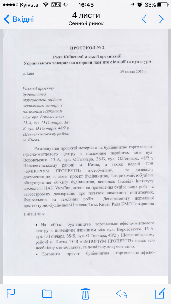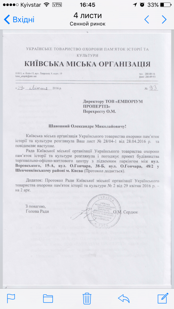 Казалось бы, человек должен знать и любить Киев. Но после увольнения из НЗ «София Киевская» она создает организацию, которая начинает разрабатывать ИГО (среди них - ИГО по застройке территории бывшего Сенного рынка), и, будучи председателем Киевской организации УООПИК – Украинское общество охраны памятников истории и культуры (КО УООПИК), одобряет его от имени этой организации, чем способствует принятию этого ИГО Минкультуры. Ниже приведено письмо-согласование ИГО КО УООПИК строительства жилого комплекса с высотностью 7-23 этажа, общей площадью 106,178 тыс. кв. метров. В нем приведены новые (по сравнению с ГУ от 2013 г.) цифры по этажности и площади комплекса. Активистам и журналистам, выступающим против стройки, известна еще одна цифра общей площади комплекса – 113,116 тыс. кв. метров. Последняя, судя по всему, является правдивой – ЖК «Ярославов градъ» огромен.