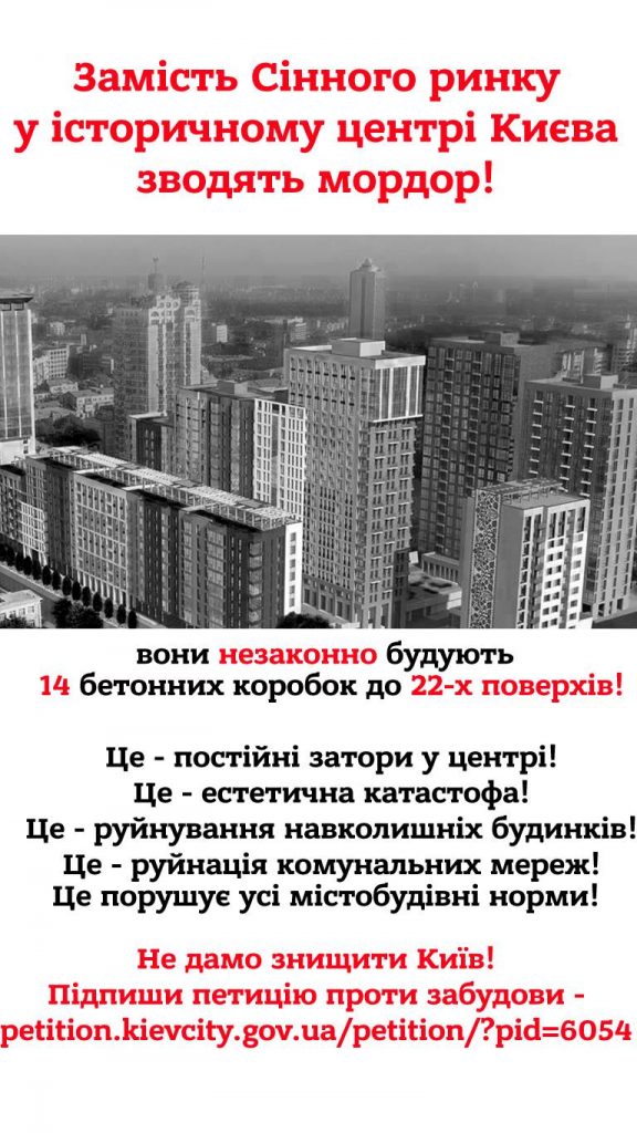 Не очень доверяя власти, один из противников существующего варианта застройки территории бывшего Сенного рынка П.Троян 10 апреля создал Петицию, в которой перечислены основные причины протеста киевлян против стройки. Это высокоплотная высотная застройка на территории почти 2га в стиле «спального района» в историческом центре столицы рядом с границей буферной зоны памятника всемирного значения «София Киевская», производящая удручающее визуальное впечатление на жителей района. Вокруг стройки располагается историческая застройка с множеством ценных памятников архитектуры, которые не выдержат (и уже не выдерживают) такого «соседа» и начнут разрушаться (что является обычным делом в Киеве, когда рядом со 100-летними домами строят современные на сваях, примеров множество. - авт.). Застройка ухудшит и без того критическую транспортную ситуацию в этом районе. Инженерная инфраструктура (электро – водо - и теплоснабжение) микрорайона не приспособлены для такого количества дополнительных зданий и жителей – расходы на ее обновление могут лечь на плечи всех горожан.