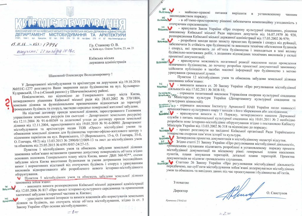 Ответ на запрос А.Станкова (ГО «БАРВИ ЖИТТЯ») о строительстве ЖК «Ярославов градъ» директора Департамента градостроительства и архитектуры А.Свистунова